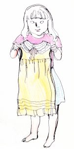 でも線が太くて、とても子どもの表情が豊かで、子ども特有のぽっこりと出たお腹やはだかんぼう、不機嫌なようす、口をとがらせた顔、などとても生き生きと描かれています。またところどころ入っている色鉛筆の色がきれいで、独特のインパクトを与えてくれます。