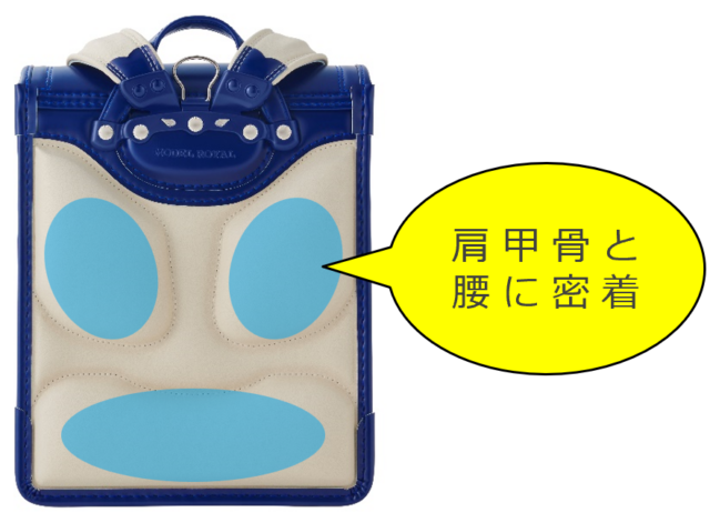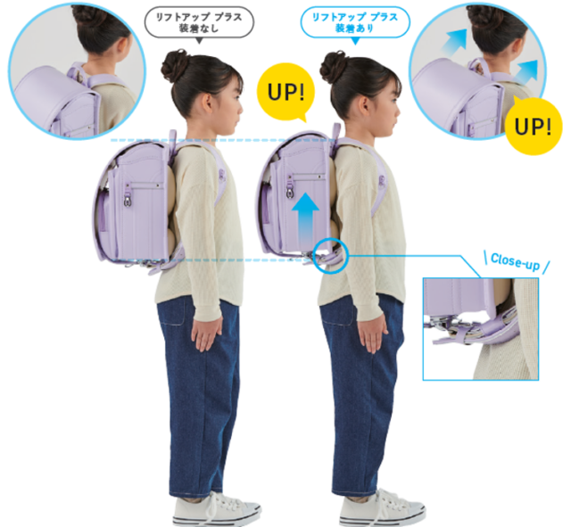 リストアッププラスは、ランドセルをリフトアップして従来品より高い位置になることで、自然な姿勢で背負えるようにした機能です。