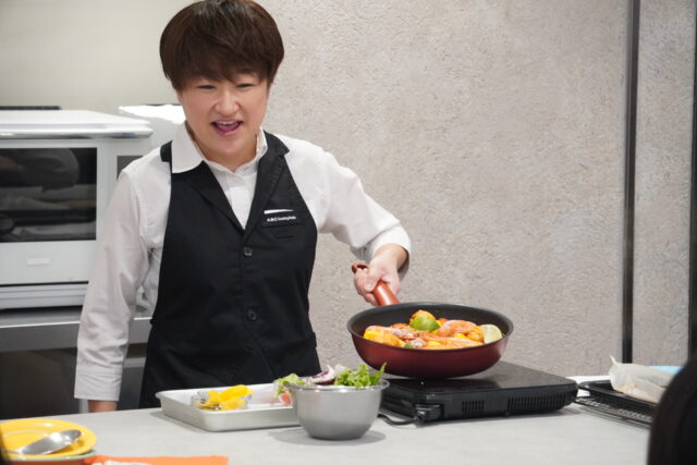 食事を楽しみながら学ぶデモレッスンで紹介されたのは、家で手軽に作れる「タンドリーチキンパエリア」と「キウイフルーツのサラダ」です。大きなスクリーンで講師の手元が映し出されるので、しっかりと手順を確認することができました。また講師の説明がポイントをおさえていてとても分かりやすく、「これなら家でもできそう!」「こうするとおしゃれ!」と参加者のみなさんも、あらかじめ用意された「タンドリーチキンパエリア」と「キウイフルーツのサラダ」を味わい、手順を確かめつつ、納得しながらメモを取っていました。