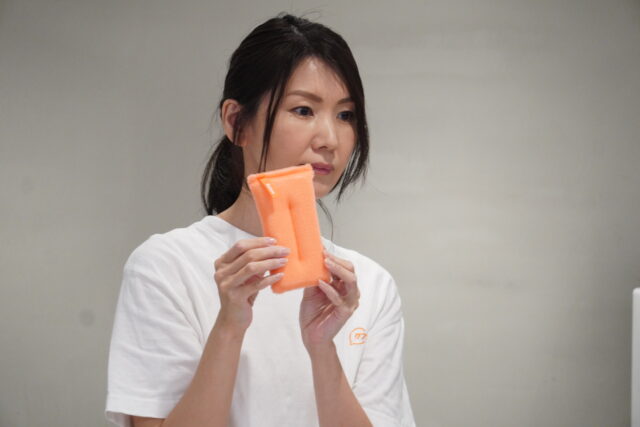 そこで、まずは参加者も各自置かれた「ブラシスポンジ」を手にしてその感触を味わいます。ざらざらしているような髪の毛より細いようなツンツンしたブラシスポンジがブラシともスポンジともちがう不思議な触り心地です。