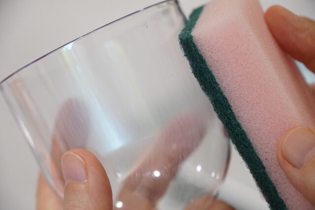 「手元に置かれたワイングラスを、実際に100円ショップで売っている研磨剤付きのスポンジでゴシゴシこすってみてください」。スタッフの声掛けで参加者はゴシゴシ。ああ、グラスは白く濁ったような傷がついてしまいました。