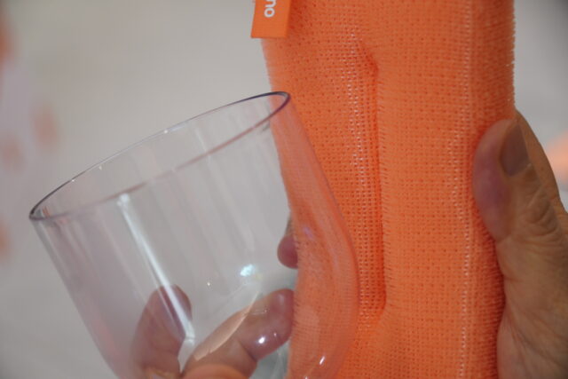 「研磨剤付きのスポンジでワイングラスを磨くことはあまりないかもしれませんが、やわらかい面で洗っていてもどうしても研磨側が触れてしまうので傷つきやすいですね」とのスタッフの説明に、経験したことがあるのかうなずく参加者も。
