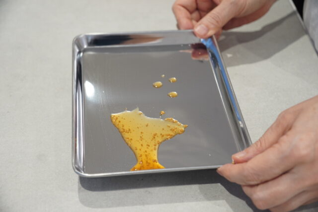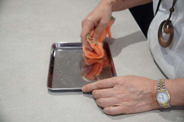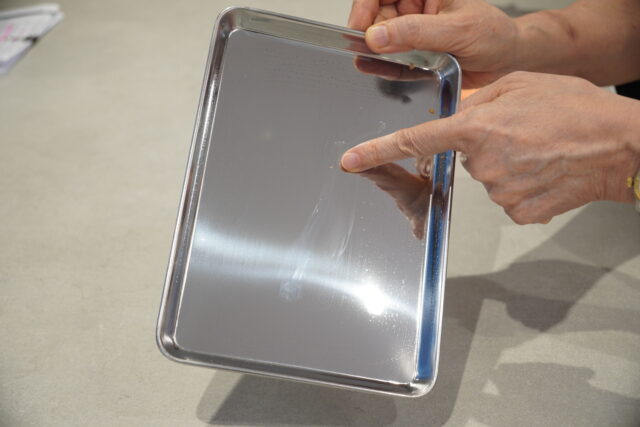 参加者全員が実際に試してみました。バットにドレッシングを垂らしてクロスでふき取ってみます。サッとひとふきで拭き取れる様子に、最初は半信半疑だった参加者からも「おお~」と次々に声が上がります。