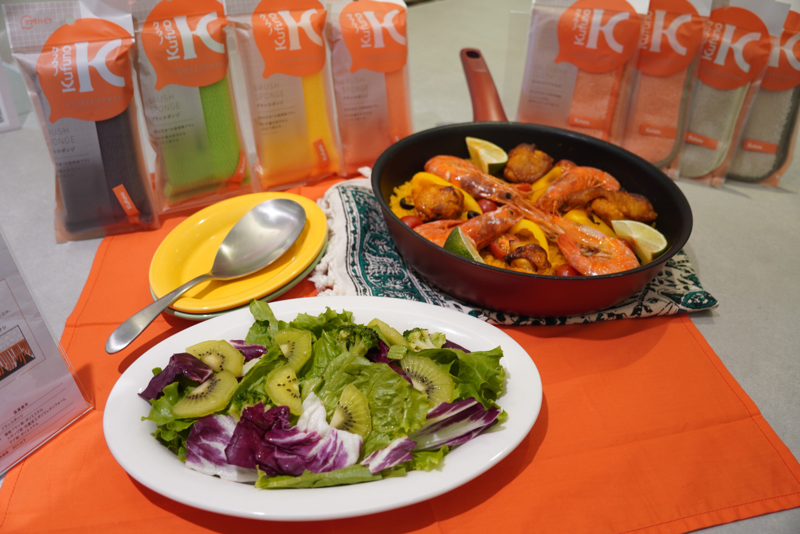 食事を楽しみながらパエリア調理のデモレッスンを見て簡単に作れるコツを学び、その後キッチンの片付けが楽になる商品「ブラシスポンジ」と「オイルクリアクロス」の紹介と、実際に商品を手に取ってその効果を実感するというダブルで楽しいワークショップでした。