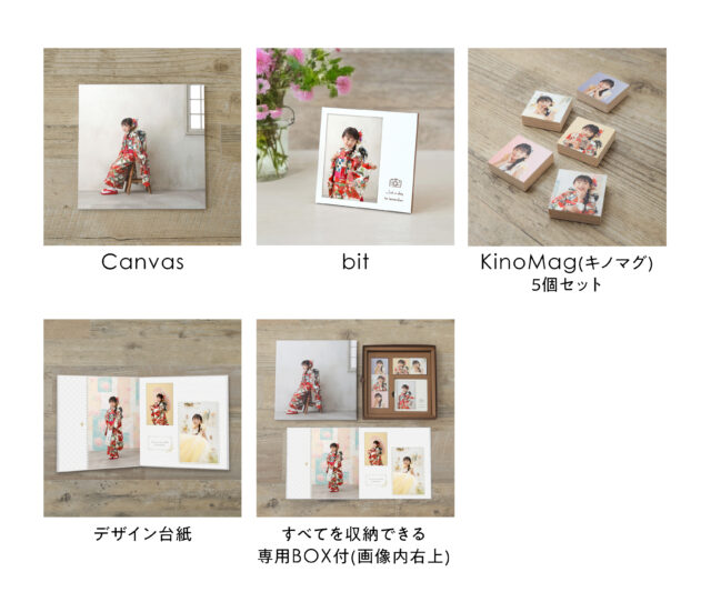 東海地方で20店舗を展開するフォトスタジオタートルでは、写真館で撮影した子どもの写真をひとつの専用ボックスにまとめて保存・贈ることができる商品「Kibaco」を期間限定で販売中。壁に掛けられる写真パネル(キャンバス)や小型のフォトフレーム、写真付マグネット、厚紙のしっかりした写真台紙など、さまざまなかたちで七五三などの成長の記録、家族の思い出を残すことができます。