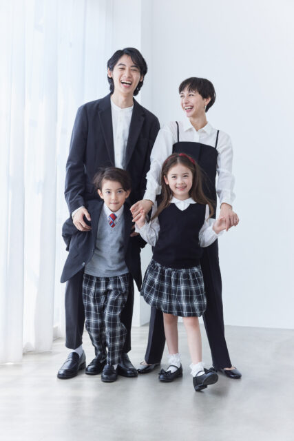 (Women)ビスチェ 6,900円、シャツ 6,900円、パンツ 5,900円 (Men)ジャケット 18,900円、シャツ 5,900円、パンツ 10,000円 (Girl)ベスト 2,900円、ブラウス 4,400円、スカート 3,900円 (Boy)ジャケット 11,800円、シャツ 4,400円、パンツ 3,900円、タイ 1,400円