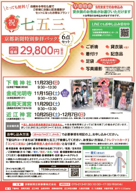 京都新聞グループの京都新聞企画事業株式会社が、京都・滋賀の由緒ある寺社仏閣でのご祈祷・記念品(千歳飴など)・貸衣装・着付け・記念撮影がセットになった「祝 七五三特別参拝パック」の予約を受付中です。税込み29,800円とお得なので、お見逃しなく!申し込みはホームページまたはメールで、詳細は公式サイトをご確認ください。