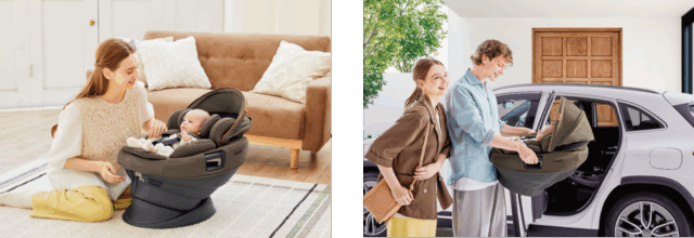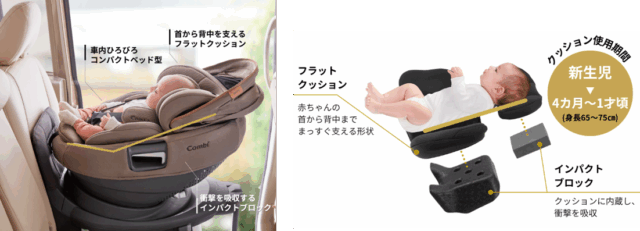 赤ちゃんの自然な姿勢をキープしつつ、衝撃を吸収してくれるのは新形状のインナークッション「フラットクッション」。慣れるまでは装着に戸惑うこともあるチャイルドシートですが、赤ちゃんを乗せるシートと車に取り付けるベースが分かれる「セパレートタイプ」なので、落ち着いた場所で赤ちゃんを乗せてから車へ移動することができるのもうれしいポイントです。