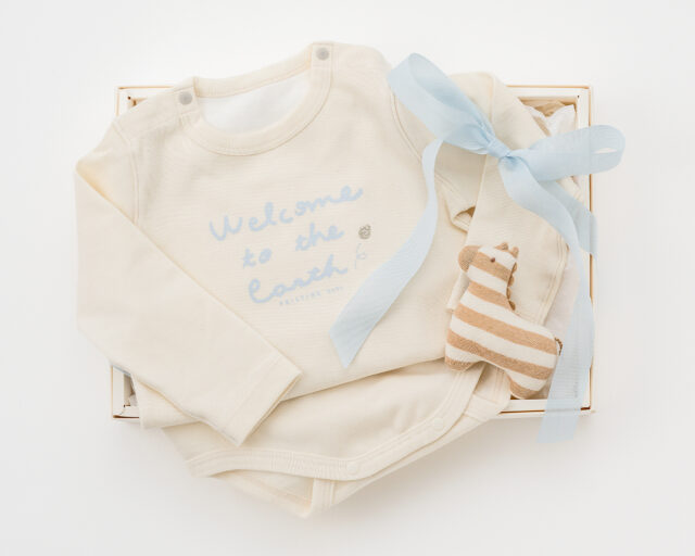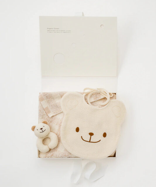 「Welcome to the earth! (ようこそ地球へ)」というメッセージ入りの肌着や、かわいい動物モチーフのスタイを、のちのちまで思い出に残る我が子の出産準備品としてそろえるのもすてき。ベレー帽やマフラーなどのあったかアイテムもそろっています。