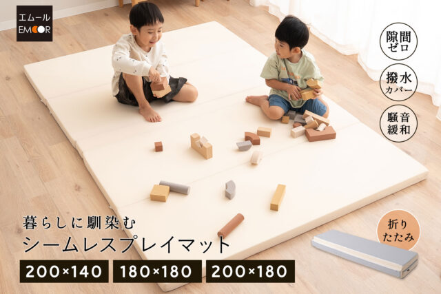健康家具ブランドEMOOR(エムール)が、隙間ゼロ×寝具品質の『シームレスプレイマット』を新発売。中材は高品質のウレタンマットでへたりにくく、カバーは撥水加工で飲みものをこぼしてもさっと拭くだけでOK、取り外して洗濯もできます。マットの表面部分に継ぎ目がないから、すきまにほこりが溜まらないのもうれしいポイント。使わない時は折りたたんで収納ができます。