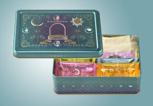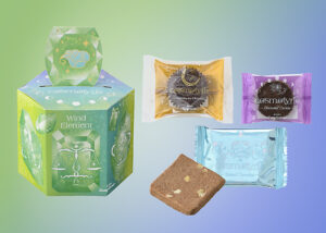 月の煌めきエレメント~風と水~ 焼菓子3種4個入540円(税込)※「月の煌めきエレメント~火と地~」のボックスもあります。月と太陽、星の軌道など宇宙の神秘的な関係性を描いた「月とおまじない缶」には、焼菓子が10個入っています。