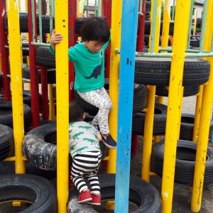 タイヤを加工した遊具もあり、タイヤのブランコは特に人気でした。タイヤの連なるトンネルをくぐったり、飛び跳ねたり、よじ登ったり。触り心地も足の感触も独特なので、みんなバランスをとるのに必死です。
