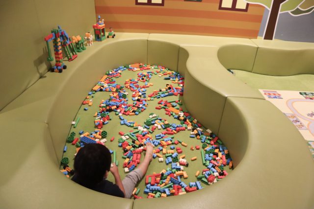 浴槽のようなかたちのブロックコーナーは、居心地が良さそう!息子も足を伸ばしてリラックスしながらタワーを作っていました。