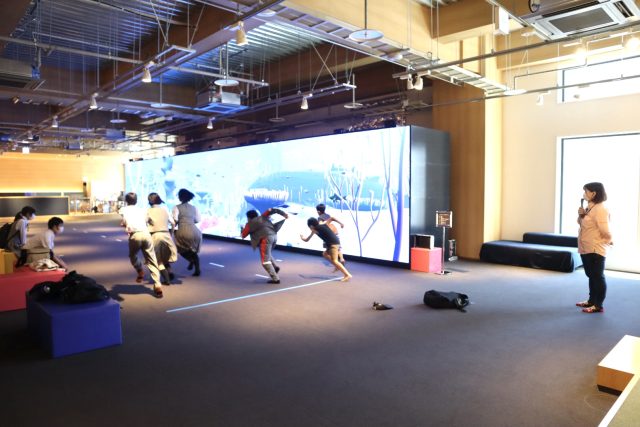 足が触れると跳ね返る光など、通る人の動きに反応する映像に大はしゃぎでした。