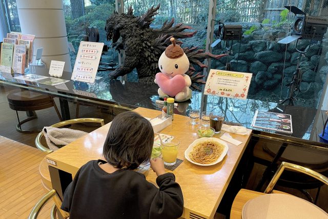 カウンター席の向こうにゴジラの着ぐるみを眺めつつ、ゆったりランチタイム(※着ぐるみは現在メンテナンス中、4月上旬頃より展示再開予定)
