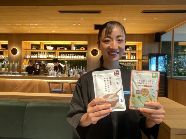 28階、29階にある飲食店では絶景とともに食事ができます。とくに子連れにおすすめだと思ったのが、ノーザンカリフォルニア料理店の「GARDEN HOUSE」です。店内はベビーカーで入店しても問題ないゆったりとした空間で、実際にテーブルにベビーカーをつけて食事を楽しむ姿も。キッズチェアはもちろん、ハンバーグプレート(1,300円)やミートボールプレート(1,000円)といったキッズメニューもありますし、こだわってセレクトしたという離乳食が取り揃えられていました。
