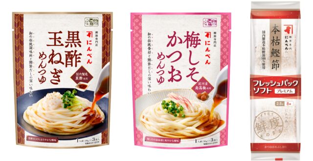 株式会社にんべんは、2026年3月1日より、涼味向け個食用めんつゆ「黒酢玉ねぎめんつゆ」と「梅しそかつおめんつゆ」を発売。